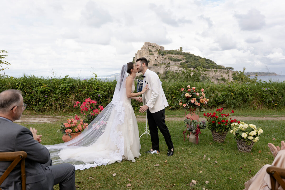 The ceremony took place in the magnificent garden of the Torre di Michelangelo, a stunning venue offering breathtaking views of the Castello Aragonese.