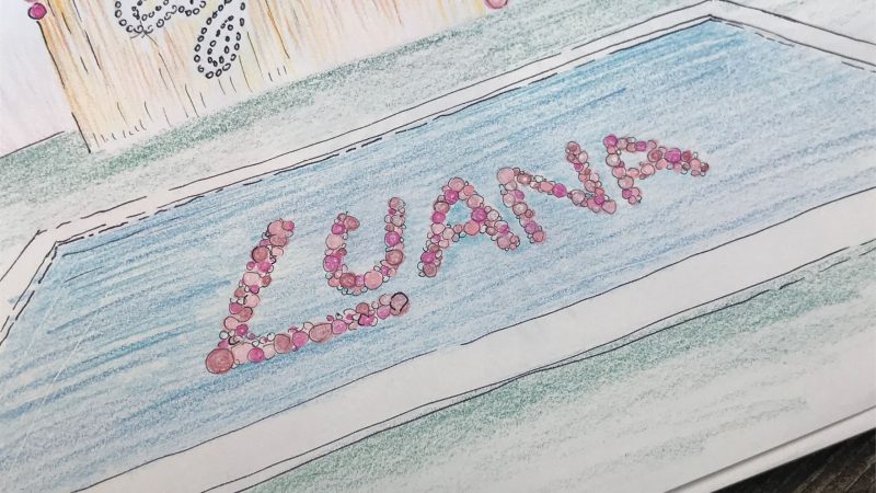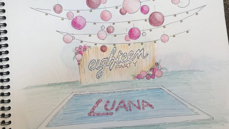 All’interno della piscina illuminata ho previsto il nome della festeggiata galleggiante composto da tanti palloncini in tinta.