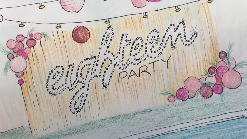 Ho immaginato un fondo istallato a distanza dalla piscina in modo da creare un’enorme scenografia illuminata e colorata: un backdrop in fili dorati e luccicosi con al centro una scritta luminosa e palloni in tinta ai lati.