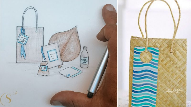 Ho anche ipotizzato un’idea alternativa, un shopper sempre in vimini o in carta stampata con tema dell’evento arricchita con nastri in tinta.