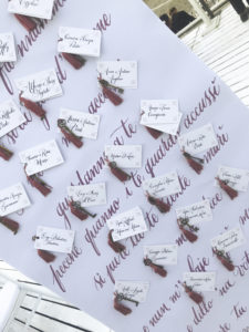 : serve agli ospiti per trovare il proprio posto al tavolo durante il ricevimento. Può essere uno o più tabelloni, di varie forme e dimensioni, contenente cartoncini di ciascun tavolo con i nomi dei commensali o dei singoli nomi di ogni invitato (escort cards). Anche in questo caso, la grafica dovrà essere abbinata a tutto il resto del coordinato cartaceo.