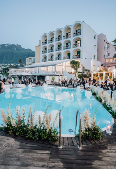 A ritmo di charleston, la cerimonia prosegue nella cornice lussuosa dell’Albergo della Regina Isabella, albergo storico nel borgo di Lacco Ameno, dove personaggi celebri dello spettacolo e poi della cultura e della politica nazionale internazionale, si sono susseguiti per godere di un ambiente di suggestiva bellezza, dagli ambienti in stile anni’50 alla prestigiosa Spa alla speciale cucina tradizionale e gourmet.
