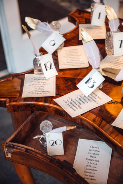 • Ritornando  ai dettagli che rievocano l’ispirazione del matrimonio scelto, abbiamo un particolare Tableau de mariage con un antico scrittoio con piume ed inchiostro che differenziano i diversi tavoli tondi allestiti, nell’affascinante sala “Sporting” della location, con maestosi vasi traboccanti di fiori bianchi e svolazzanti piume Bianche.